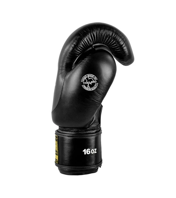Unique premium hand made in Bangkok, Thailand (HMIT) Boxing gloves. Black cowhide leather with Metallic gold highlight logos and labels. These Velcro closure training gloves are perfect for all aspects of boxing and Thai boxing training. Bag/Pad work, drilling, sparring, anything you can throw at them!