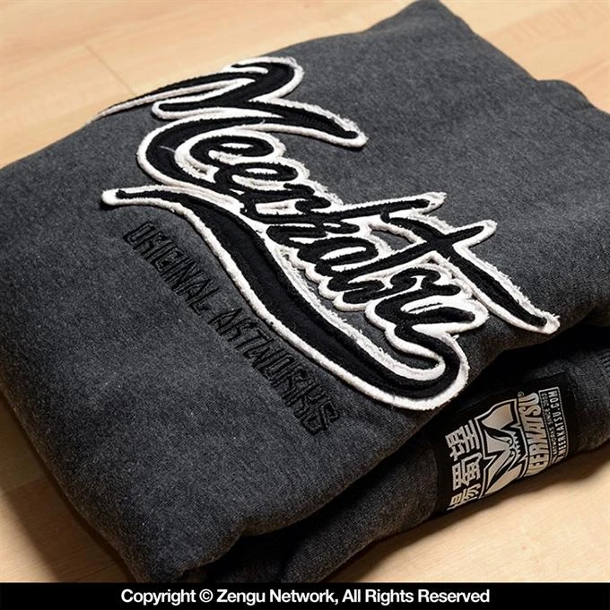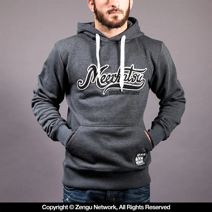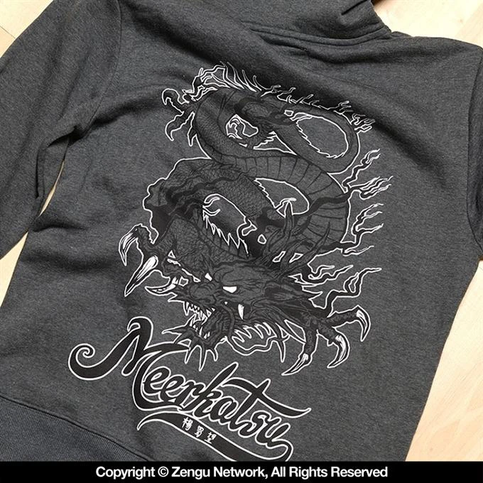 Meerkatsu’s original Kiss of the Dragon hoodie is built from a super soft 80/20 cotton/poly blend, weighing in at 330 GSM. The chest logo is done via unique 3-D applique lettering, the white outline offering a nice contrast against the heather grey fabric. Around back, the heather grey fabric serves as the canvas for hand-drawn illustrations by the one and only Meerkatsu. These original drawings are applied to the hoodie with water-based inks. Other specs include a roomy front pouch pocket and wide ribbed cuffs/hem to keep the warmth in when you need it. Equipped with a double-layered hood, adjusted via a thick drawstring.