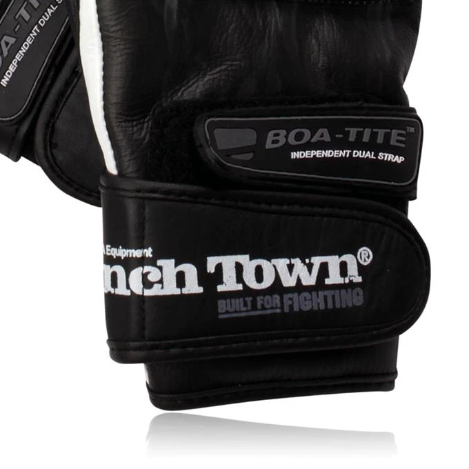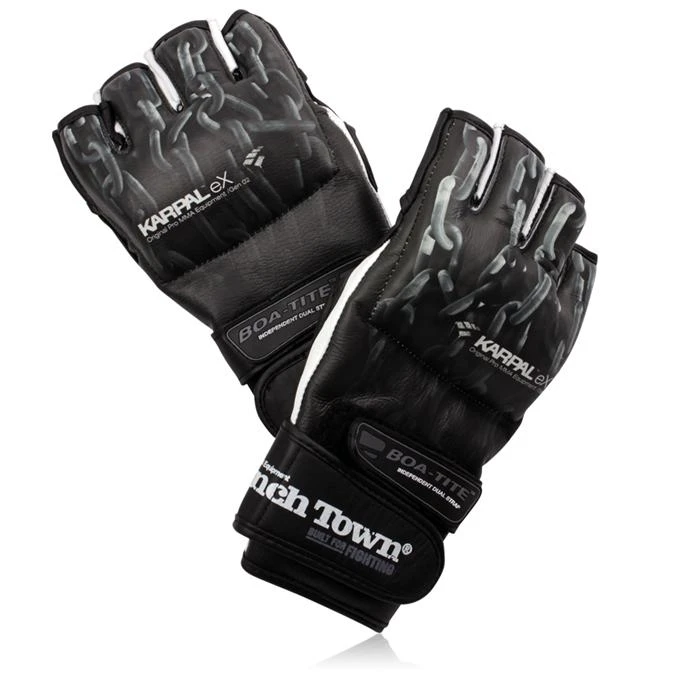 PunchTown has assembled one of the finest pairs of 4 oz. gloves to ever hit the MMA market. The leather is not only intricately detailed, but it”s an improved cowhide leather. The TAT2 leather surface is treated to be far more resistant to blood and sweat, as well as far less vulnerable to scratches and scuffs. Underneath this exceptionally pliable leather is a 3-layer padding system. The impact areas feature more dense protection while the outer-most layer provides a uniquely soft feel. The wrist is secured by the traditional leather strap as well as PunchTown”s “Boa-Tite” Independent Dual Strap, which results in a very simple and air-tight closure… Really a step-up from more complicated or bulky dual strap systems. Adding to the unique look of the KARPALs is the PunchTown logo, which is now printed into the leather strap instead of a sewn-on patch.