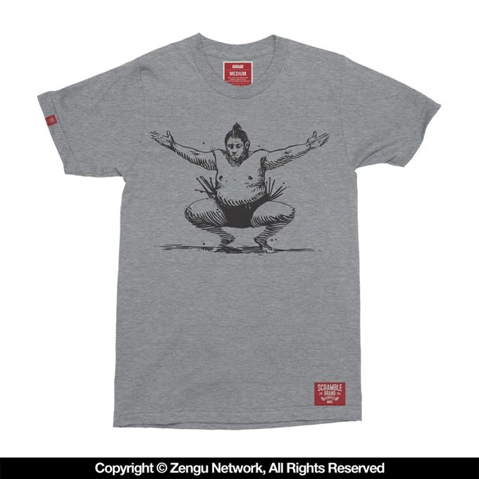 The new Sumo tee from Scramble! Printed on a soft cotton tee with a brushed vintage finish. The “zero-hand-feel” discharge prints are smooth and soft without compromising their detail or quality, including chest, back, and sleeve graphics. Standard fit premium tees.