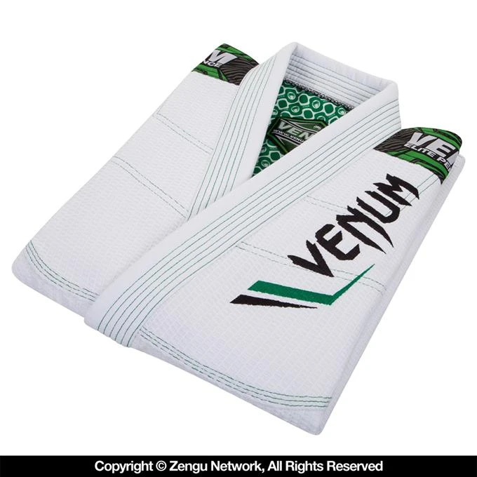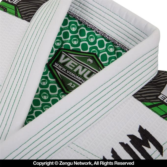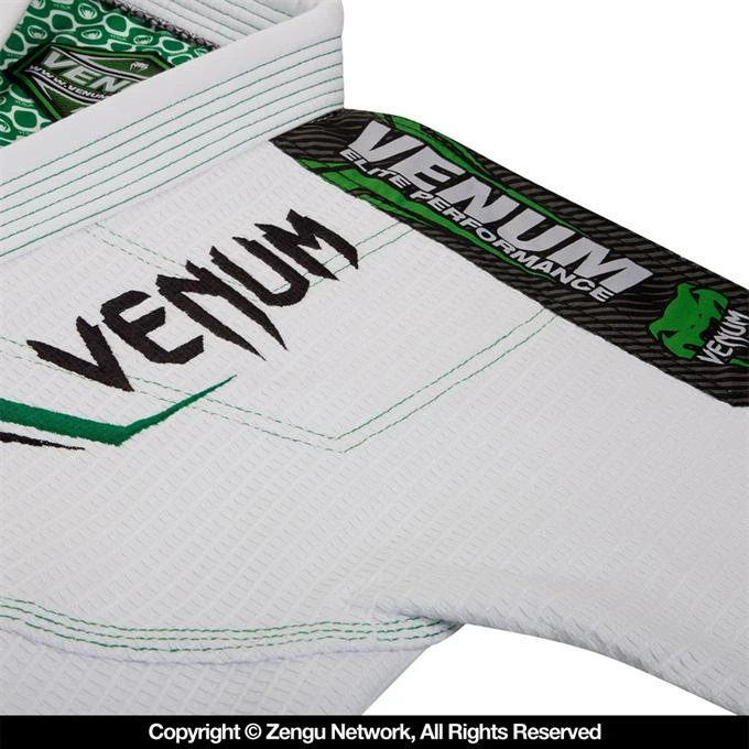 The “Elite” Gi from Venum is arguably their best-looking Jiu Jitsu Gi yet. The graphics and color combos look great in the form of high-quality embroideries and woven patches against the premium white fabrics. Constructed with pre-shrunk materials including 500 GSM Gold weave and lightweight ripstop. There’s no shortage of reinforcement stitching or paneling, making the Elite a Gi that’s equipped for daily rolling or the most rigorous of competition runs. Other specs include a sublimated inner yoke panel, multiple drawstring loops, and a round draw cord.